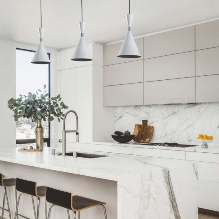 CLASSIC metal pendant Series provides a bold statement through the conical design and colour. Ideal as a breakfast bar pendant, as well as in cafes and bars. Available in Red and White finishes.