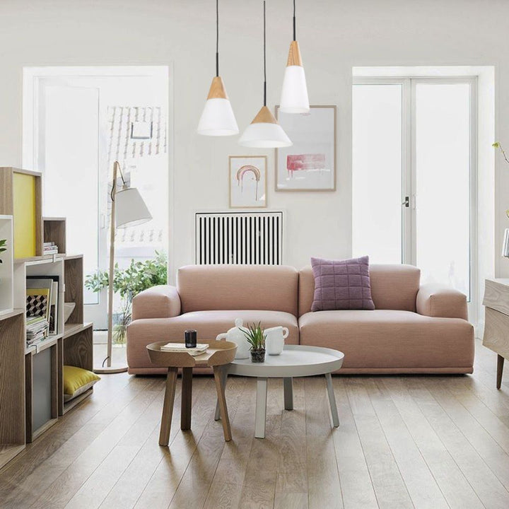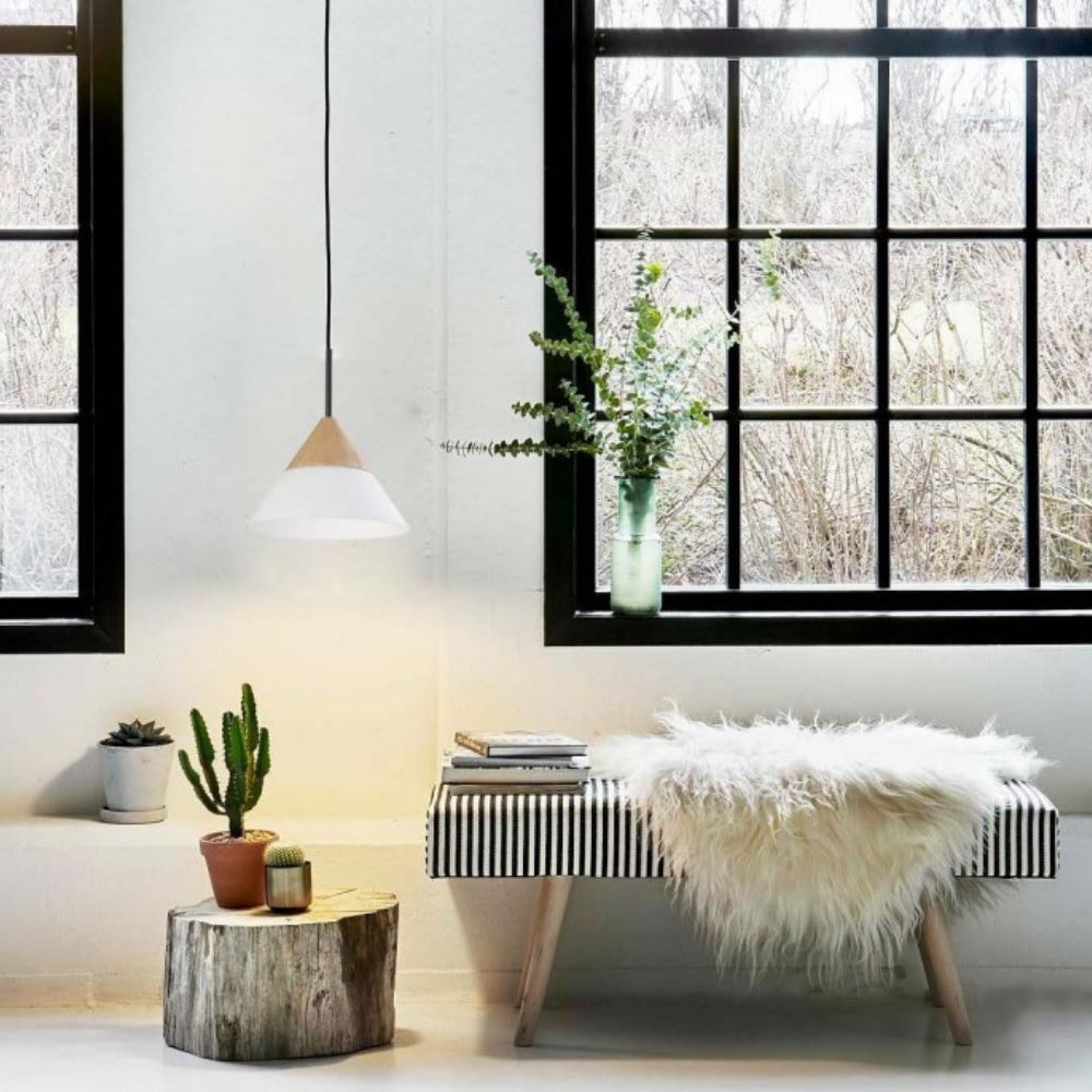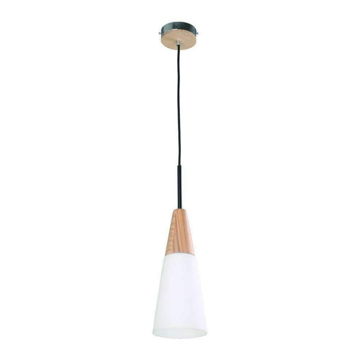 The FINN pendant series features opal glass shades adorned with timber accents. Perfect for a breakfast bar pendant, or as a unique statement when hung in a cluster of three or more, with varying heights. Options include thin cone, medium cone, and wide cone glass varieties.