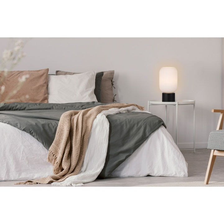 Inspired by traditional lanterns, the minimalist and elegant NORI collection features a variety of lamps and pendants. Mouth-blown opal-matte glass patterned with a soft, ridged design creates soothing, atmospheric light and is paired with rich satin-black metalware and textile cabling.