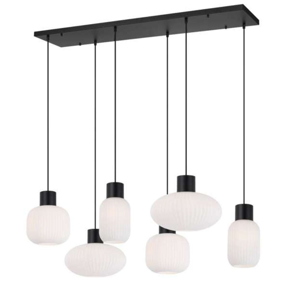 Inspired by traditional lanterns, the minimalist and elegant NORI collection features a variety of lamps and pendants. Mouth-blown opal-matte glass patterned with a soft, ridged design creates soothing, atmospheric light and is paired with rich satin-black metalware and textile cabling.