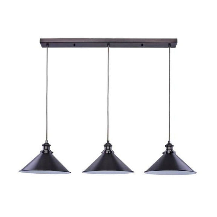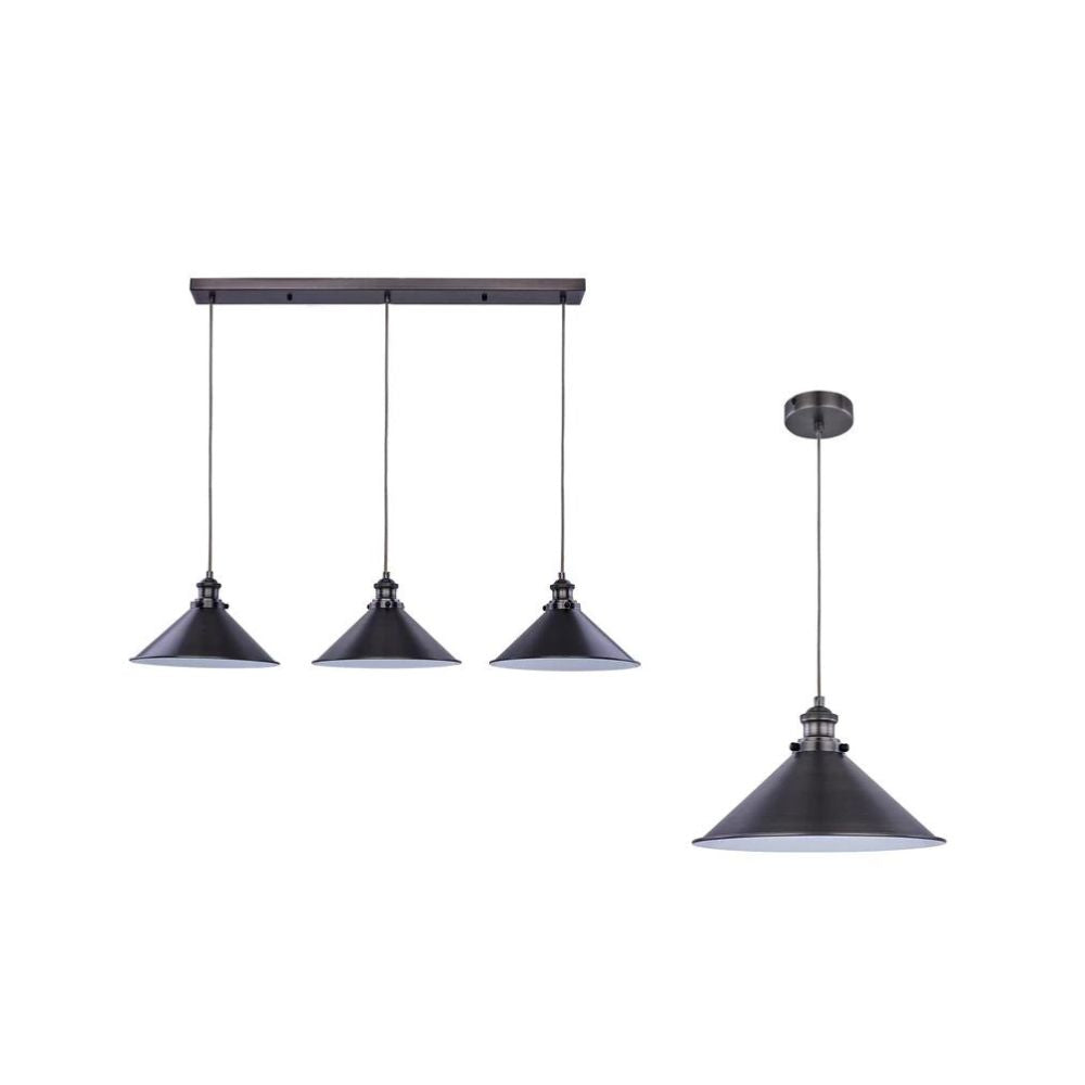 The Brightys single and triple pendant light offer a sleek contemporary take on a classic cone-shaped light fitting. Featuring a pewter brushed metal finish on both the base and lampshade. The suspended lampshade base has an industrial-stylised, knurled metal ring with slick black fastening screws to hold the wide, coned lampshade.