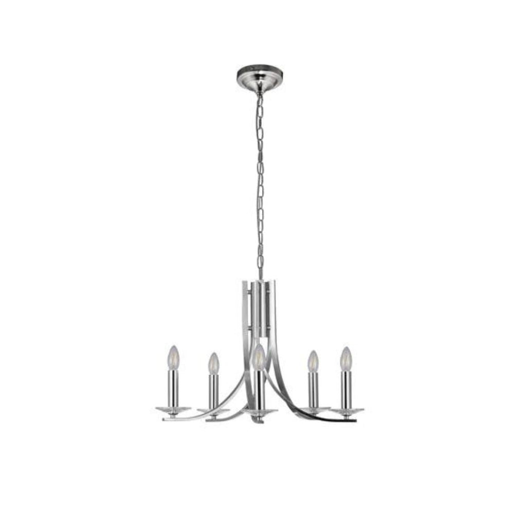 A contemporization of a medieval design, the CORRINE 5 Light Chandelier makes for a striking addition to transitional spaces. Ideal for entranceways and above dining room tables, the fixture is available in either antique brass or satin chrome finishes.