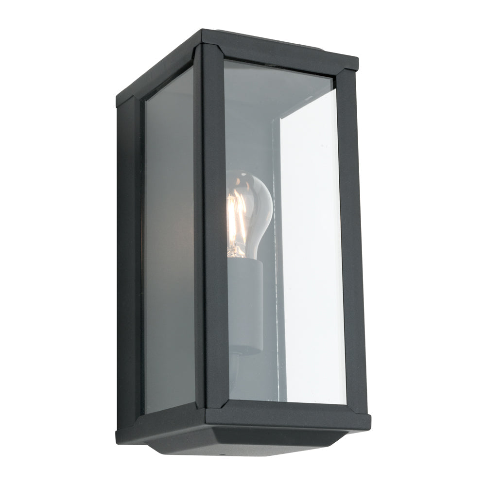 The ANGLESEA is a modern and decorative IP44 Wall light that offers an attractive solution to front facades or back patio areas as a feature where ambient feature lighting is required. Featuring a Black Aluminium frame, with a clear glass enclosure to the globe holder behind.