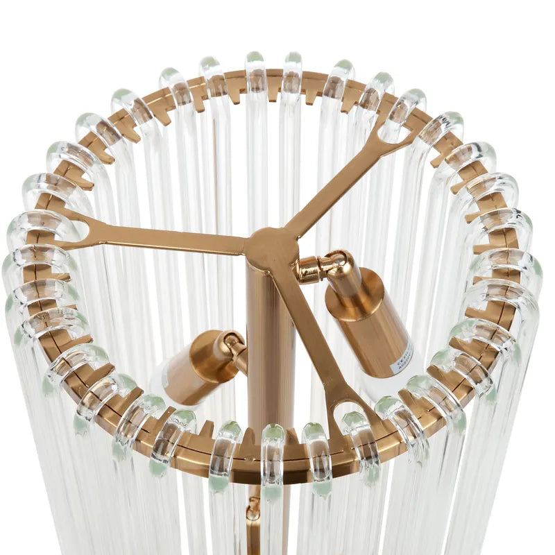 Hand-crafted glass rods cascade effortlessly over a plated brass frame as a delicate diffused glow is reflected through the elegant glass rods of the Zara Floor Lamp. Referencing the decadent Art Deco era, the pendant offers a modern interpretation of timeless glamour.