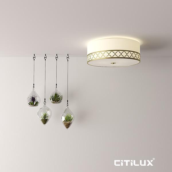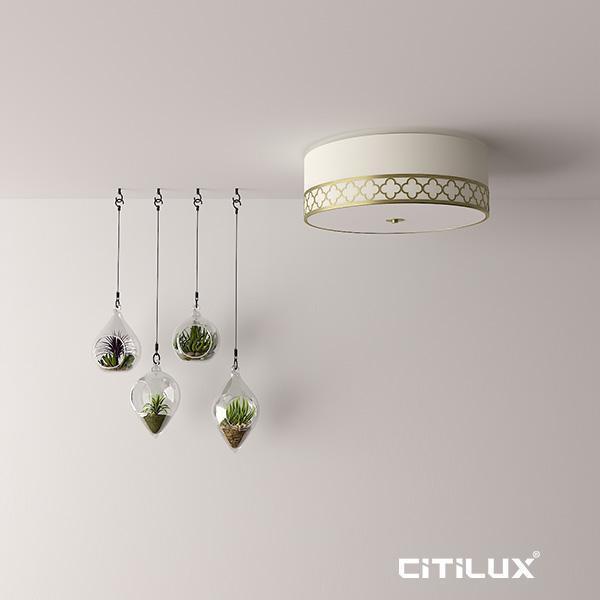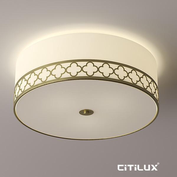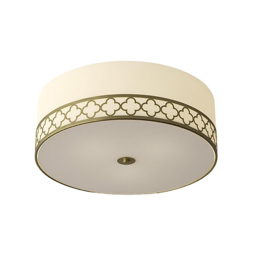 NEW JERSEY is a cylinder ceiling light with an off white fabric shade and white diffuser. Featuring an antique brass flourish pattern creating an elegant traditional look. Requires 3 x E27 globe (not included)